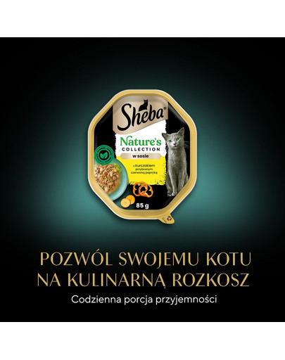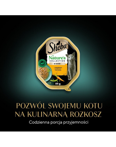 Sheba Nature’s Collection to mieszanka starannie wyselekcjonowanych, delikatnych kawałków w wykwintnym sosie. Propozycja posiłków zachwyci podniebienia nawet najbardziej wymagających kotów. Mistrzowsko przygotowane posiłki z naturalnych składników wysokiej jakości, z witaminami oraz minerałami. Te bezzbożowe receptury oczarują Twojego kota tym, co najlepsze z natury. W każdej tacce znajdują się składniki odżywcze, wspierające prawidłowe funkcjonowanie Twojego kota. Pozwól swojemu kotu na kulinarną rozkosz, aby mógł delektować się pyszną karmą Sheba Nature’s Collection, która zaspokoi nawet najbardziej wybredny apetyt.