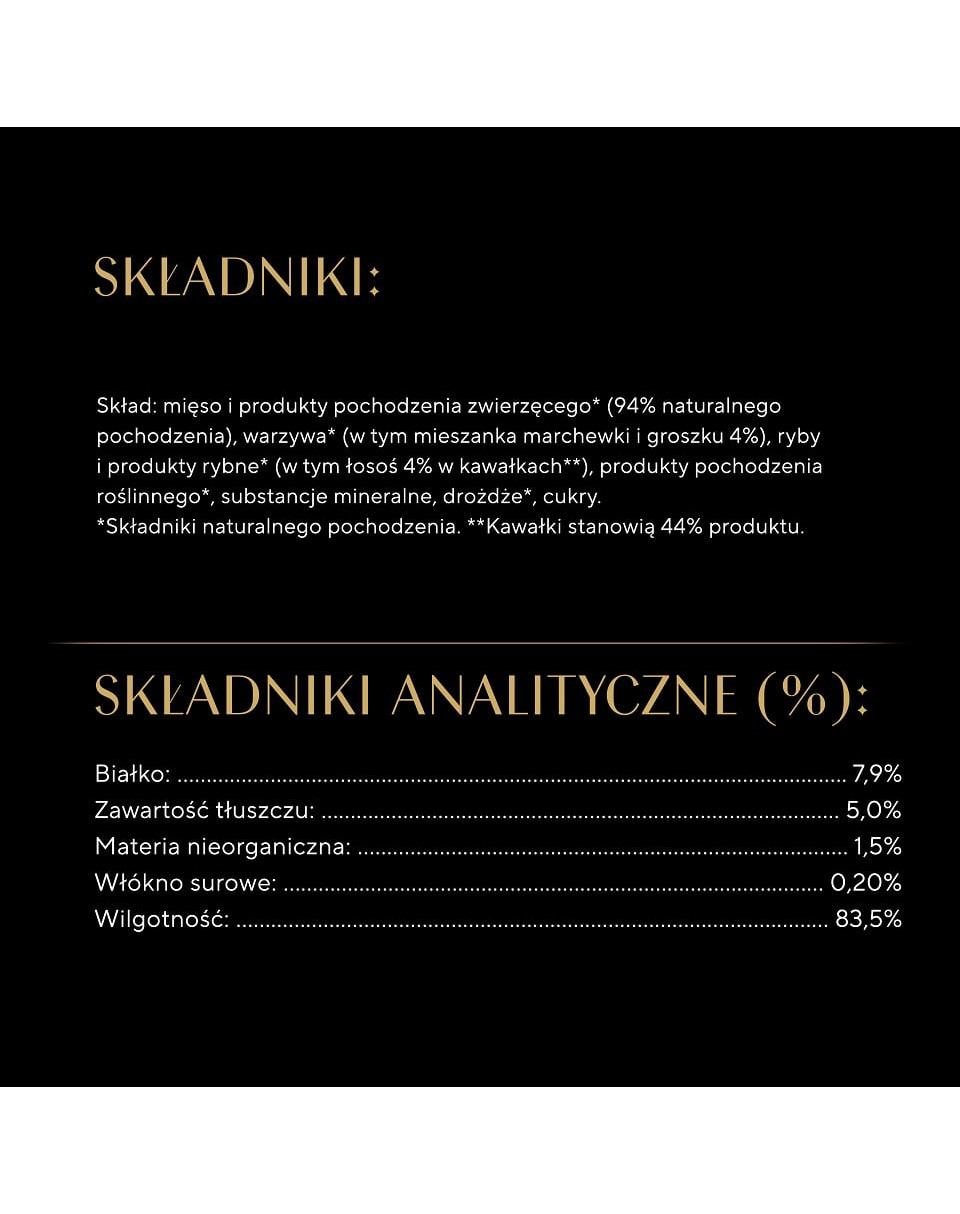 Skład: mięso i produkty pochodzenia zwierzęcego* (94% naturalnego pochodzenia), warzywa* (w tym mieszanka marchewki i groszku 4%), ryby i produkty rybne* (w tym łosoś 4% w kawałkach**), produkty pochodzenia roślinnego*, substancje mineralne, drożdże*, cukry. *Składniki naturalnego pochodzenia. **Kawałki stanowią 44% produktu.