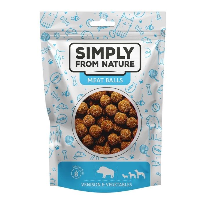 Simply from Nature Meat Balls to karma uzupełniająca dla psów, podawaj jako przekąskę między posiłkami głównymi. Zaleca się nie przekarmiać zwierzęcia.