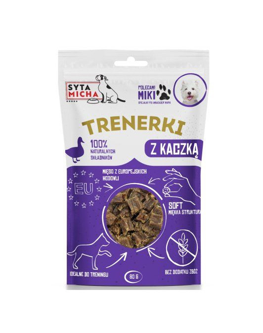 Treningówki dla psa z kaczką. Są produktem monobiałkowym, idealnym dla psów z alergią. Zawierają witaminy A, C i E dla wzmocnienia odporności.