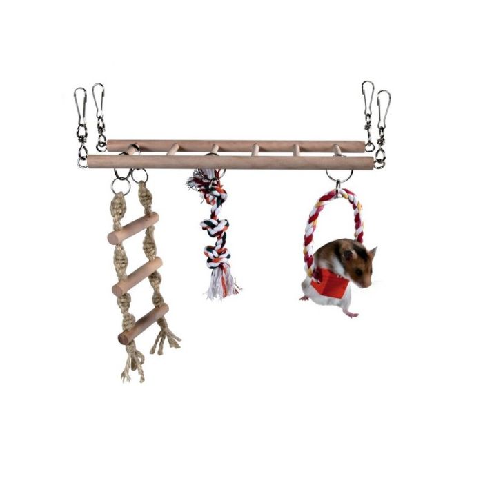 Drabinka wykonana z kory drzewnej, metalu i bawełnianej liny dla chomików lub myszy. Konstrukcja składa się z mostów, drabin, lin i pętli linowych z drewnianymi klockami. Drabinka zapewni wiele godzin aktywnej i wesołej zabawy, dostarczając wielu atrakcji i pomagając zachować dobrą formę.