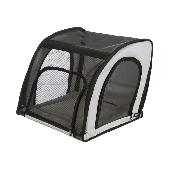 Siateczki umożliwiają bardzo dobrą cyrkulację powietrza, a zapięcia na zamki bezproblemowe i szybkie dostanie się do psa. Transporter samochodowy można otworzyć z przodu i z boku.