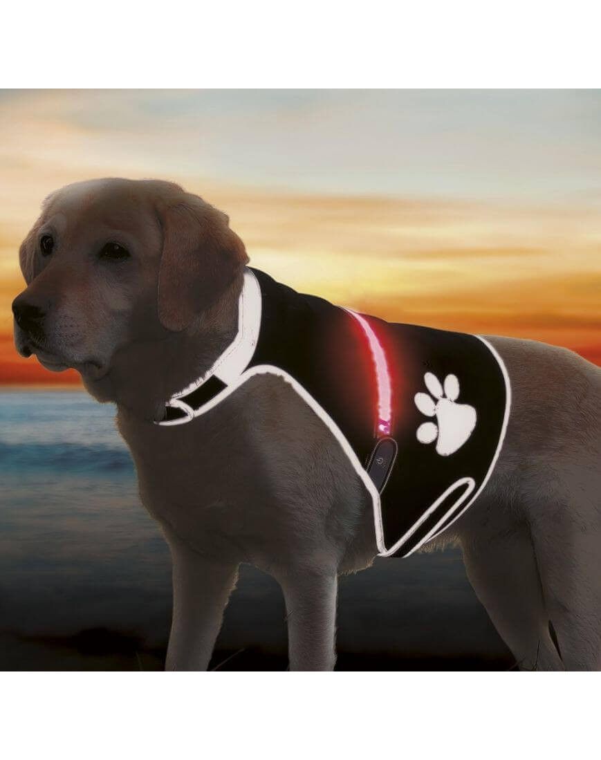 Kamizelka z elementem świecącym w tylnej części ( dwa tryby świecenia: ciągły i migający. Dzięki temu pies jest doskonalne widoczny w czasie spaceru.