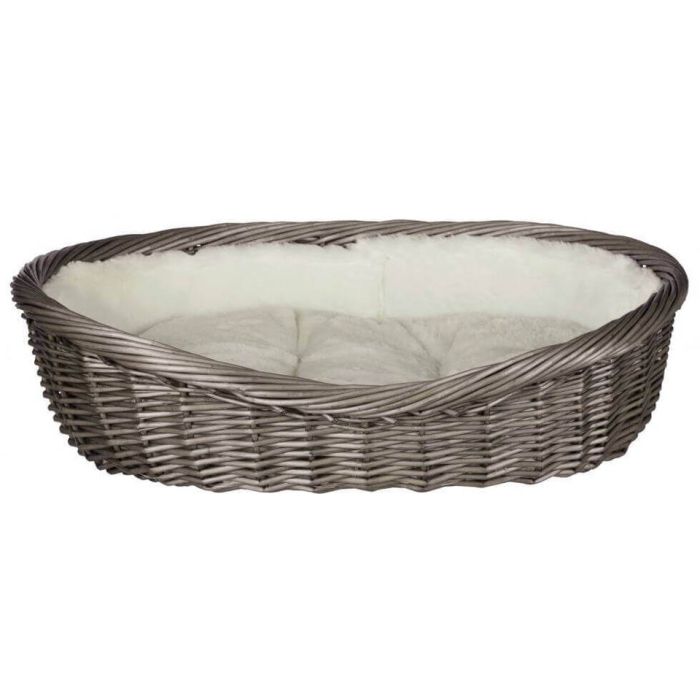 Legowisko z ciemnej wikliny. Ma szerokie, wygięte obrzeże. W środku miękka wyściółka i poduszka. Poduszka ma wypełnienie z flauszu poliestrowego i pokrycie z bawełny/pluszu,.