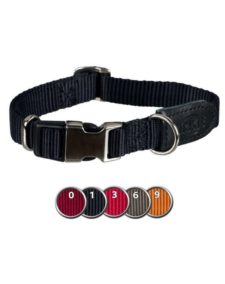 Obroża z wysokiej jakości paska nylonowego. W pełni regulowana, z klamrami.