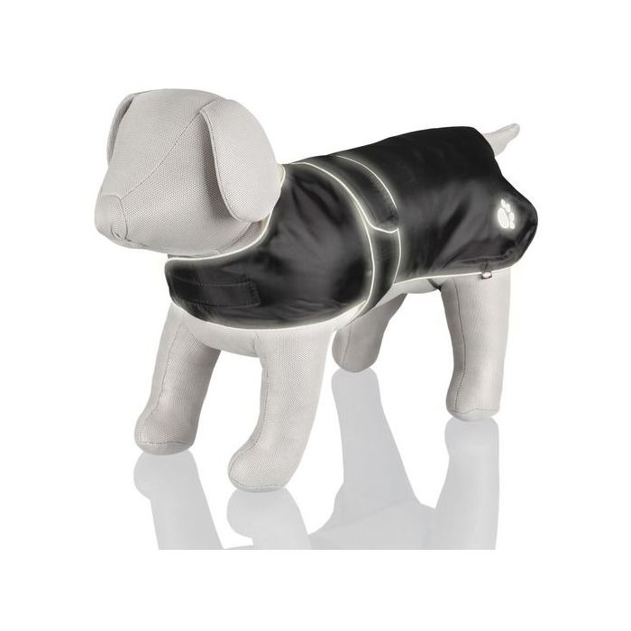 Wykonana z wytrzymałego nylonu, chroni przed deszczem, wiatrem, zabrudzeniami. Wewnętrzna część płaszczyka ma wszytą miękką podszewkę z flauszu utrzymującą ciepło. Ubranko posiada zapięcia na rzep oraz dodatkowy ściągacz na tylnych łapach, co zwiększa przyleganie płaszczyka. Odblaskowy znaczenia oraz element w kształcie łapy zwiększa widoczność psa w ciemności.