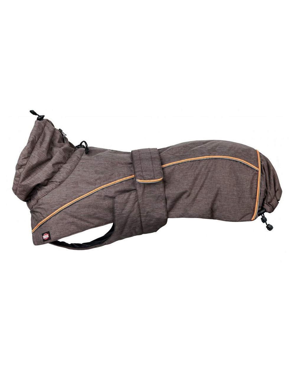 Brązowy, wodoodporny płaszczyk dla psa. Przeznaczony na jesienne i zimowe spacery.