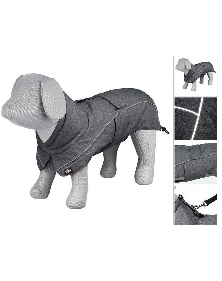 Wykonany z poliestru, posiada dodatkową teflonową powłokę, która jest wiatroszczelna, chroni przed zamoczeniem i pobrudzeniem. Wewnątrz ubranka znajduje się miękka, przyjemna w dotyku i ciepła podszewka. Płaszczyk zapinany jest na rzepy, co przyspiesza jego zdejmowanie oraz zakładanie. Wysoki kołnierz chroni szyję i poprawia komfort termiczny psa. W celu domontowania smyczy i szelek, producent umieścił dwa wodoodporne suwaki, na szyi oraz w tylnej części. Elementy odblaskowe zwiększają widoczność psa po zmroku, a tym samym jego bezpieczeństwo. Ubranko wykonane jest z najwyższej jakości materiałów, przez co cechuje się wysoką wytrzymałością.