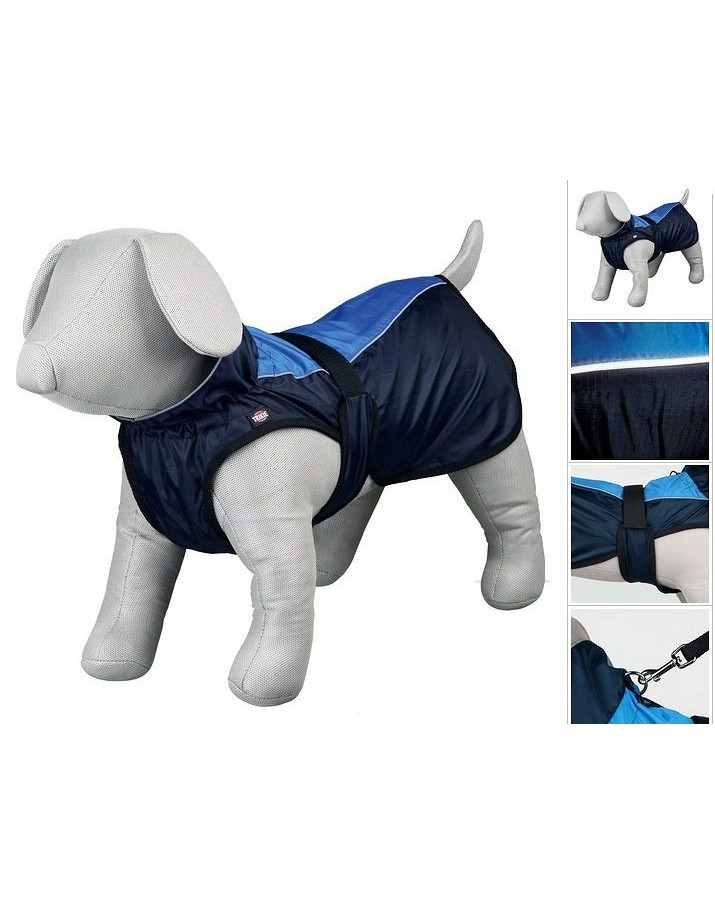 Na grzbiecie znajduje się otwór do przypięcia smyczy, a zapięcie na rzepy ułatwia zakładanie i zdejmowanie kurtki.