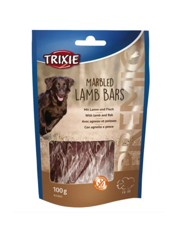 Paski z jagnięciną i rybą. Zawartość mięsa wynosi ok. 72%, a ryb ok. 8%.