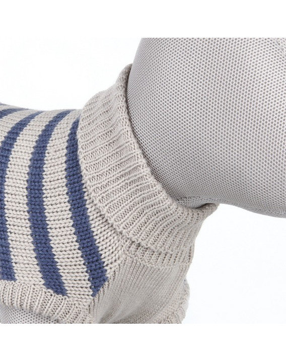 Wykonany z syntetycznej wełny jest bardzo dobrze skrojony i przyjemny dla ciała. Posiada otwór na wpięcie smyczy, a także golf i ściągacze na rękawach. Pętelki na tylne łapy zapobiegają przesuwaniu się ubranka. Modny wzór, nawiązujący do żeglugi, rozjaśnia pochmurne dni.
