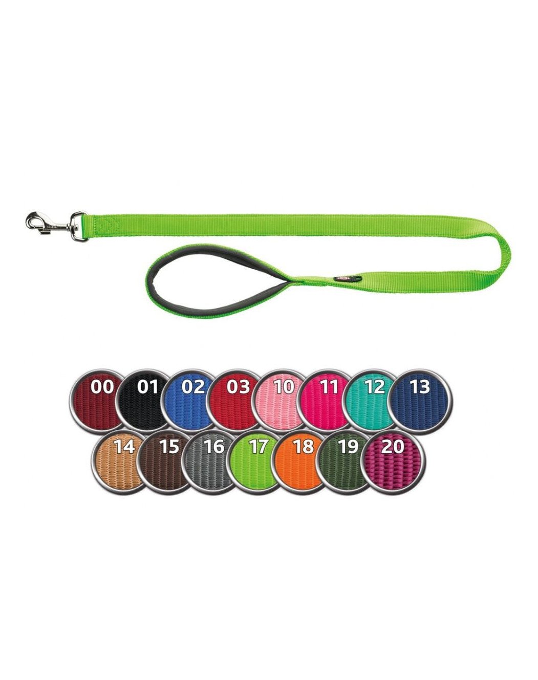 Bardzo wytrzymała smycz taśmowa. Uchwyt z obiciem z neoprenu. Dodatkowy pierścień na podwieszenie np. adresówki