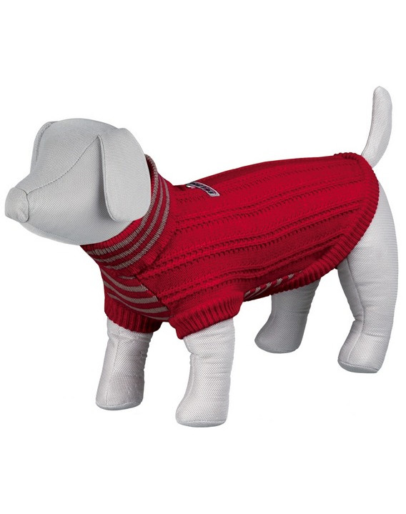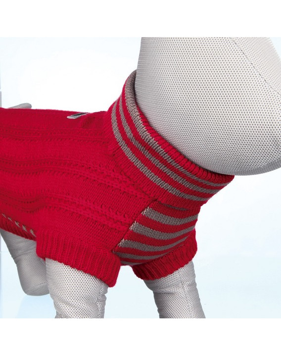 Wykonany z syntetycznej wełny, jest dopasowany i przyjemny dla ciała. Posiada pętelki na tylne łapy oraz ściągacze. Na plecach widnieje haft. Sweterek posiada miejsce na wpięcie smyczy.