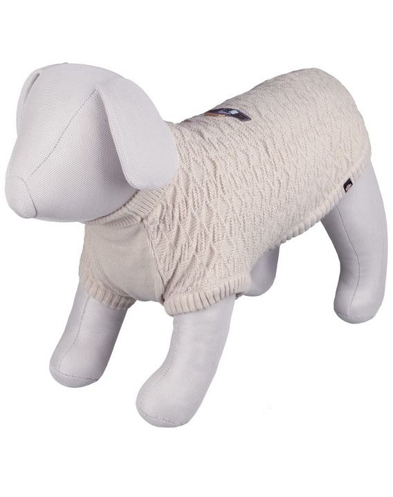 Bardzo dobrze leży i dopasowywuje się do ciała. Pętelki na tylne nogi zapobiegają przesuwaniu się, a jednocześnie nie krępują ruchów. Ubranko wykonane jest z syntetycznej wełny, posiada modne detale na plecach i miejsce na wpięcie smyczy. Wzór na sweterku dodaje klasy i elegancji.