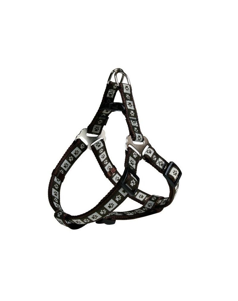 Szelki regulowane na dwóch paskach, zapinane na plecach. Materiał wytrzymały, ze względu na zastosowanie podwójnej warstwy nylonu. Dodatkowo naszyta beżowa taśma z motywem psich łap.