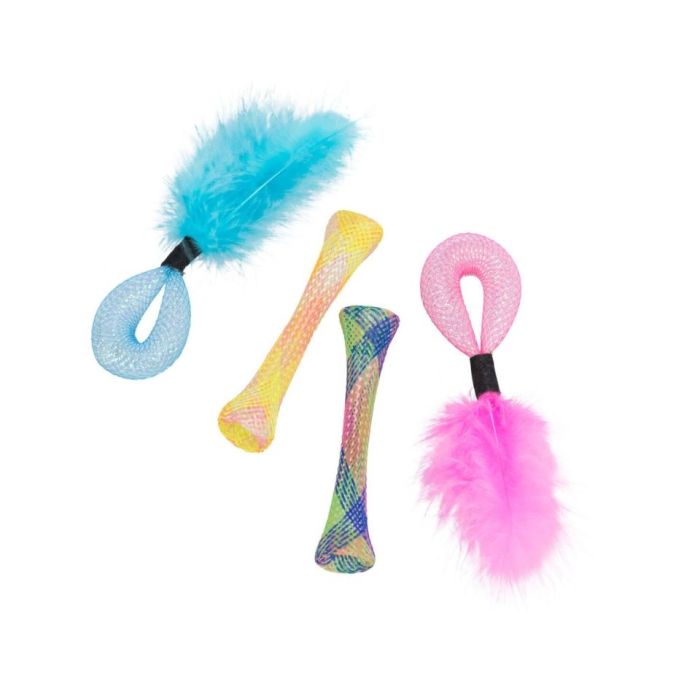 Zabawki zostały wzbogacone naturalną kocimiętką, która działa pobudzająco na większość kotów, zachęcając je do dłuższej i intensywniejszej zabawy. Dodatkowo każda z zabawek posiada grzechotkę, która aktywuje instynkt łowiecki i przyciąga uwagę pupila.