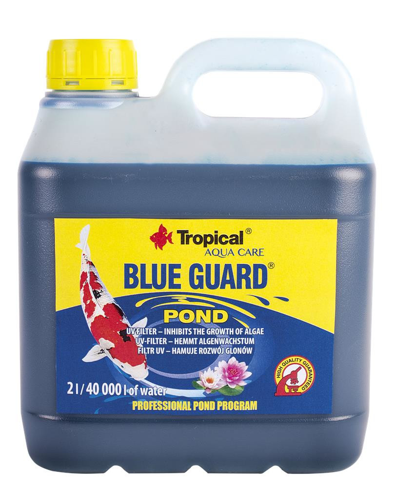 Preparat jest bezpieczny dla ryb, bezkręgowców i roślin wodnych, w prosty i skuteczny sposób chroni ogrodowe oczka wodne przed masowym rozwojem glonów. Blue Guard Pond zabarwia wodę w oczku na błękitny kolor, ograniczając przenikanie promieni słonecznych w głąb wody, dzięki czemu hamuje rozwój niepożądanych glonów, w tym tych odpowiedzialnych za powstawanie tzw. zielonej wody. Preparat nie ogranicza fotosyntezy pozostałych roślin wodnych. Dodatkowo, błekitne zabarwienie podkreśla kolory karpi koi i innych ozdobnych ryb znajdujących sie w oczkach wodnych.