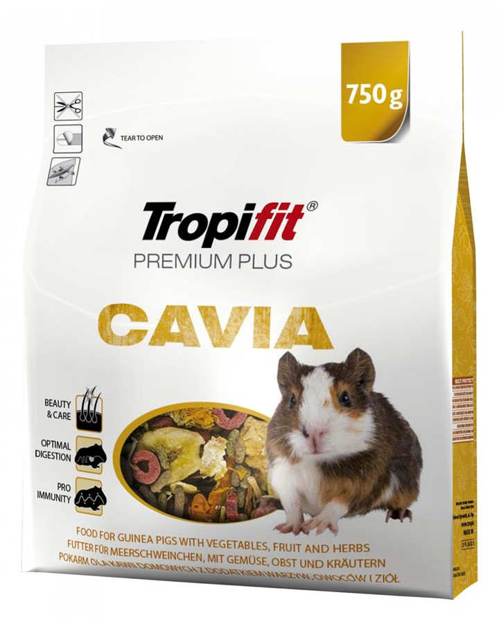 Tropifit Premium Plus Cavia to pełnowartościowy pokarm dla kawii domowych na bazie granulatów z lucerną, jabłkiem oraz z dodatkiem suszonych, bogatych w witaminy warzyw, owoców i aromatycznych ziół. Właściwości prebiotyczne wielu składników pokarmu stymulują rozwój prawidłowej flory bakteryjnej jelit i wspierają układ odpornościowy. Dodatek zeolitu zmniejsza nieprzyjemny zapach odchodów. Pokarm nie zawiera składników zmodyfikowanych genetycznie (GMO), konserwantów, wzmacniaczy smaku, dodatku cukru i aromatów.