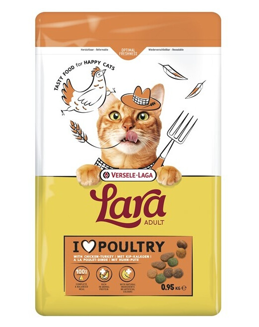 Pełnoporcjowa karma Lara Adult Turkey & Chicken to pyszne granulki z kurczakiem i indykiem, które zapewniają dorosłym kotom zdrowe, zbilansowane żywienie. Opracowana z myślą o kotach domowych i wychodzących, dostarcza wszystkich niezbędnych składników – białka, tłuszczów, witamin i minerałów – wspierających witalność i dobre samopoczucie.