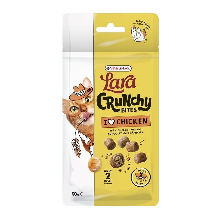 Lara Crunchy Bites with Chicken Happy Teeth to chrupiące kąski o pysznym smaku kurczaka, stworzone z myślą o zdrowiu jamy ustnej kotów. Dzięki zawartości heksametafosforanu sodu, przysmak pomaga ograniczać odkładanie się kamienia nazębnego i wspiera utrzymanie świeżego oddechu.