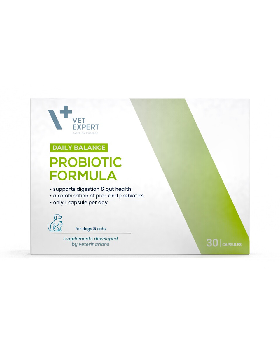 VET EXPERT Daily Balance Probiotic Formula to kompleksowy preparat łączący działanie probiotyku i prebiotyku, stworzony w celu wspierania prawidłowego trawienia oraz równowagi mikrobiomu jelitowego u psów i kotów. Regularne stosowanie może pomóc w stabilizacji pracy układu pokarmowego, poprawie komfortu jelitowego oraz wzmocnieniu naturalnej odporności związanej z florą bakteryjną jelit.