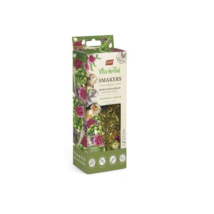 Smakers Vita Herbal to w 100% bezbożowy przysmak idealny dla każdego gryzonia i królika. Brokuły i róża to nie tylko piękno barwnej kompozycji, ale bogactwo witamin i minerałów zawarte w smakowitym przysmaku. Brokuły mają działanie profilaktyki przed rakiem, wrzodami żołądka, anemią, a także korzystnie wpływają na funkcjonowanie wzroku i regulują poziom cukru we krwi. Płatki róży są bogate w składniki mineralne i witaminę C, co szczególnie polecane jest podczas żywienia świnek morskich (kawii domowej). Dodatkowo posiadają właściwości antyseptyczne i przeciwzapalne. Dodatek pestek dyni sprawia, że przysmak jest jeszcze chętniej chrupany. Smakers Vita Herbal to samo zdrowie, a jego twarda struktura dodatkowo pielęgnuje ząbki, wspierając ich regularne ścieranie.