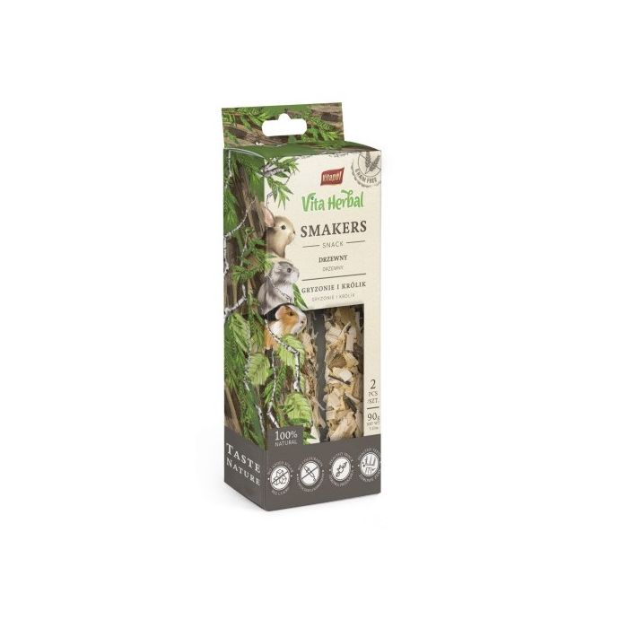 Smakers Vita Herbal to w 100% bezbożowy przysmak idealny dla każdego gryzonia i królika. Smakers drzewny jak wskazuje nazwa składa się z kory i gałązek drzew liściastych. Pełni rolę naturalnego gryzaka dla prawidłowego ścierania siekaczy, a dodatkowo twarta struktura przysmaku jeszcze bardziej sprzyja niniejszemu procesowi. Gałązki i kora są dodatkowo doskonałym źródłem włókna, korzystnie wpływaja na układ pokarmowy zwierząt, łagodzi objawy biegunki i nieżytów jelit.