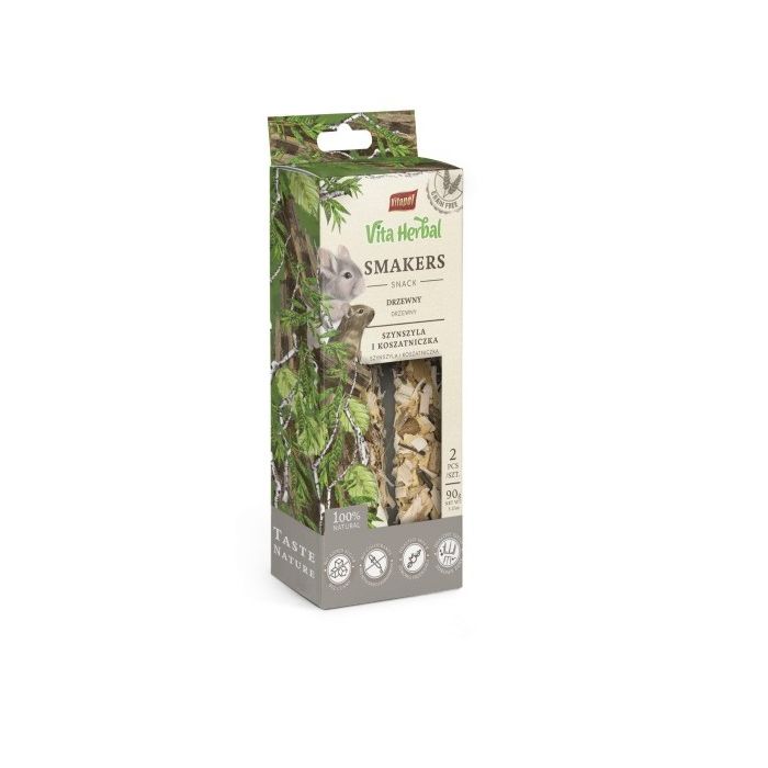 Smakers Vita Herbal to w 100% bezbożowy przysmak idealny dla szynszyli i koszatniczek. Smakers drzewny jak wskazuje nazwa składa się z kory i gałązek drzew liściastych. Pełni rolę naturalnego gryzaka dla prawidłowego ścierania siekaczy, a dodatkowo twarta struktura przysmaku jeszcze bardziej sprzyja niniejszemu procesowi. Gałązki i kora są dodatkowo doskonałym źródłem włókna, korzystnie wpływaja na układ pokarmowy zwierząt, łagodzi objawy biegunki i nieżytów jelit. Smakersy nie zawierają dodatku cukru czy też miodu.