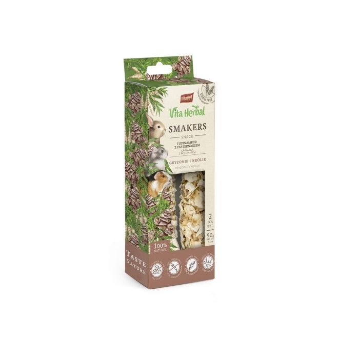 Smakers Vita Herbal to w 100% bezbożowy przysmak idealny dla każdego gryzonia i królika. Suszone bulwy topinamburu są najcenniejszym źródłem inuliny - cukru, który w sposób naturalny obniża poziom gluzkozy we krwi, polecany wszystkim gatunkom zwierząt. Wspiera również układ trwienny oraz nerwowy. A do tego jest niesamowicie smakowity i chętnie zjadany przez zwierzęta. Pasternak jest bogaty w minerały i witaminy oraz ma właściwości oczyszczające organizm. Smakers Vita Herbal to samo zdrowie, a jego twarda struktura dodatkowo pielęgnuje ząbki, wspierając ich regularne ścieranie.