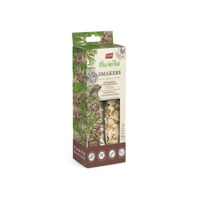 Smakers Vita Herbal to w 100% bezbożowy przysmak idealny dla szynszyli i koszatniczek. Suszone bulwy topinamburu są najcenniejszym źródłem inuliny - cukru, który w sposób naturalny obniża poziom gluzkozy we krwi, polecany wszystkim gatunkom zwierząt. Wspiera również układ trwienny oraz nerwowy. A do tego jest niesamowicie smakowity i chętnie pobierany przez zwierzęta. Pasternak jest bogaty w minerały i witaminy oraz ma właściwości oczyszczające organizm. Smakers Vita Herbal to samo zdrowie, a jego twarda struktura dodatkowo pielęgnuje ząbki, wspierając ich regularne ścieranie.
