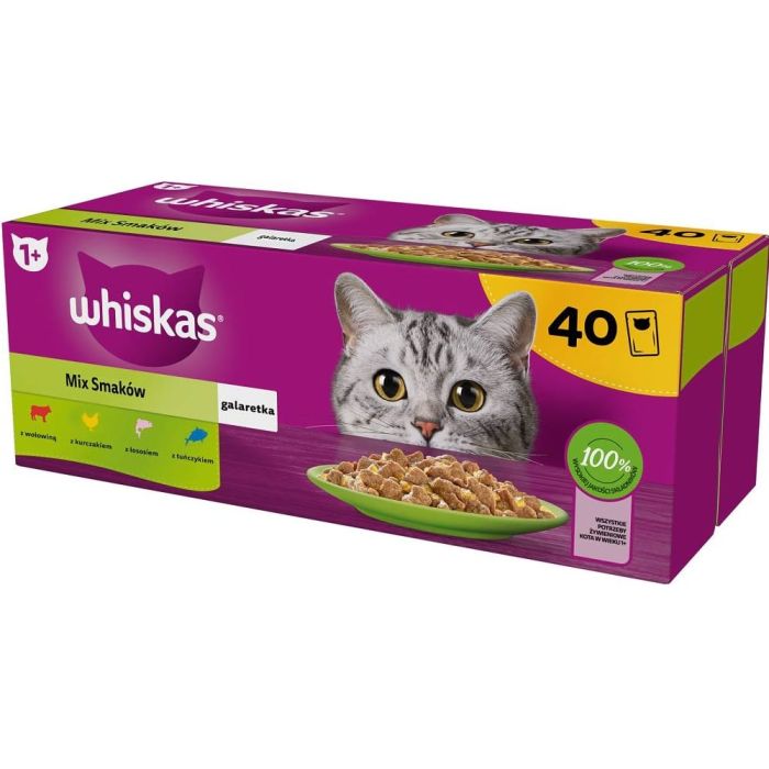 WHISKAS Adult 40x85g Smaki Rybne i Tradycyjne mokra karma dla kota w galaretce (z kurczakiem, z łososiem, z wołowiną, z tuńczykiem)