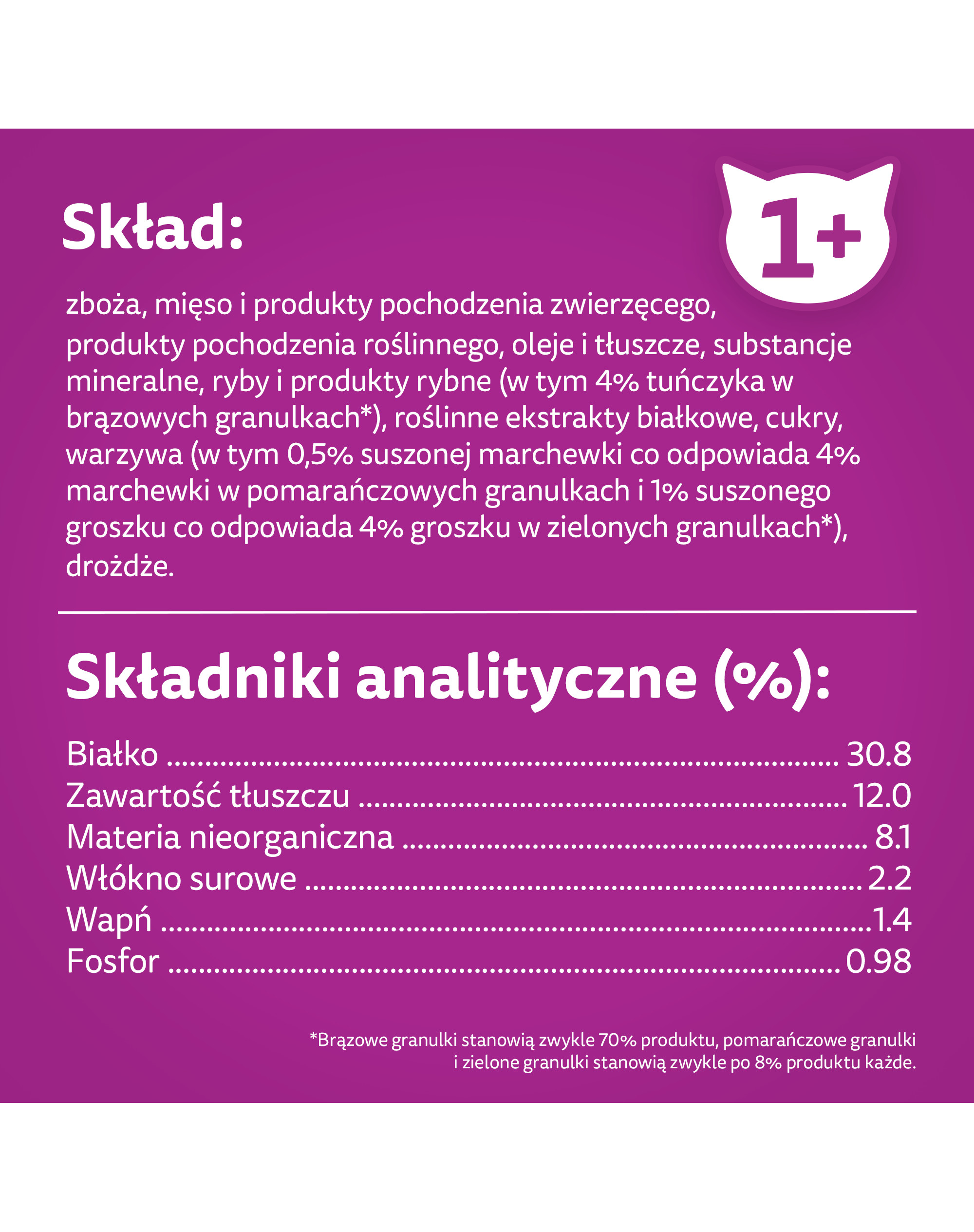 Skład: zboża, mięso i produkty pochodzenia zwierzęcego, produkty pochodzenia roślinnego, oleje i tłuszcze, substancje mineralne, ryby i produkty rybne (w tym 4% tuńczyka w brązowych granulkach*), roślinne ekstrakty białkowe, cukry, warzywa (w tym 0,5% suszonej marchewki co odpowiada 4% marchewki w pomarańczowych granulkach i 1% suszonego groszku co odpowiada 4% groszku w zielonych granulkach*), drożdże.