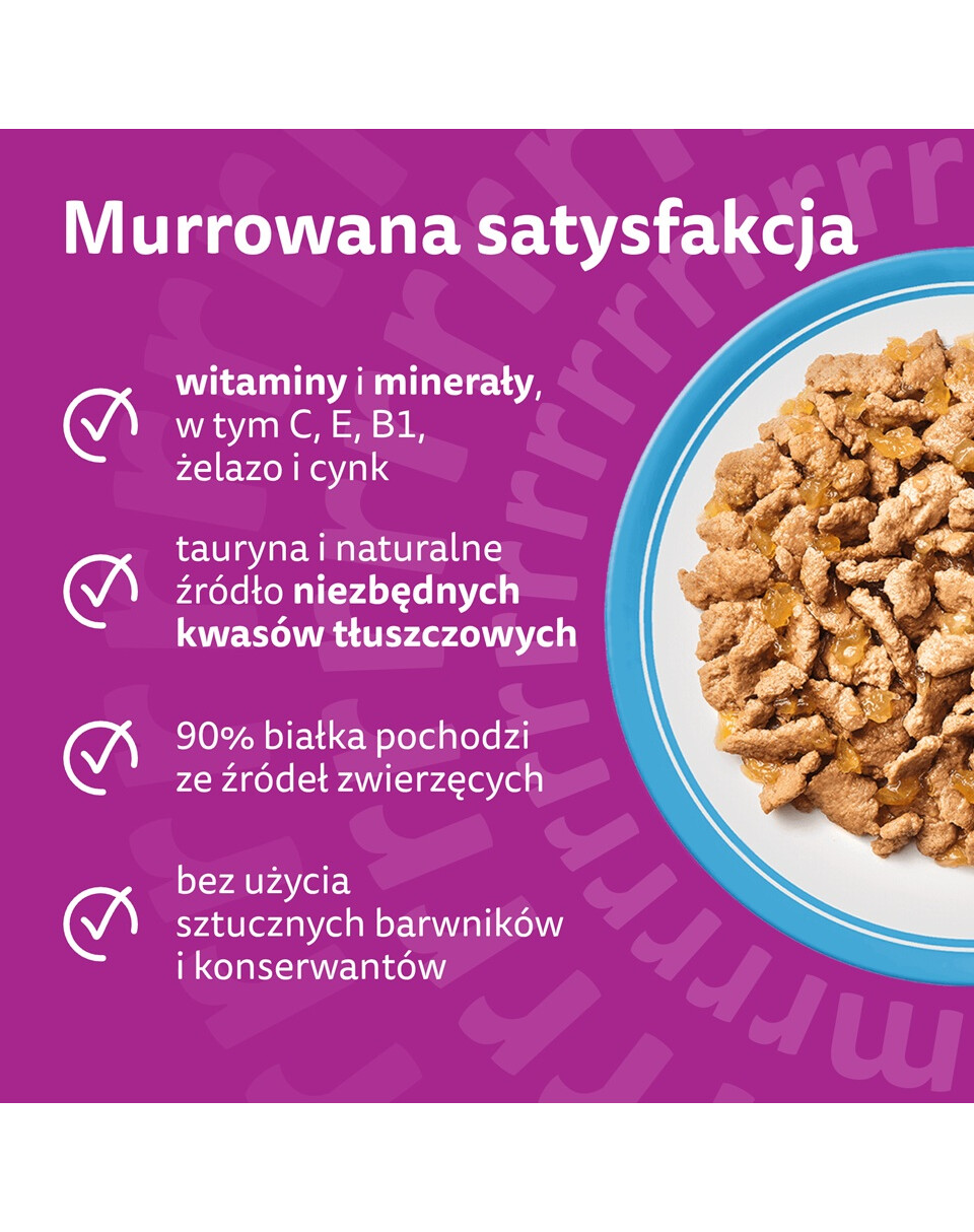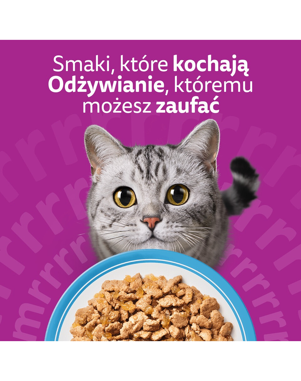 Napisz opinięNasza gama produktów WHISKAS została stworzona, by zapewnić maksimum mruczenia – podczas posiłków i nie tylko! Każda receptura jest starannie przygotowana, aby zachować naturalne wartości odżywcze i pyszny smak wysokiej jakości składników, dzięki czemu Twój kot z radością przybiegnie do miseczki.