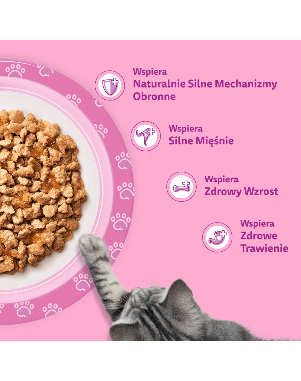 · Przepyszne smaki w mniejszych kawałkach, aby wspomóc wzrost małych mruczków.