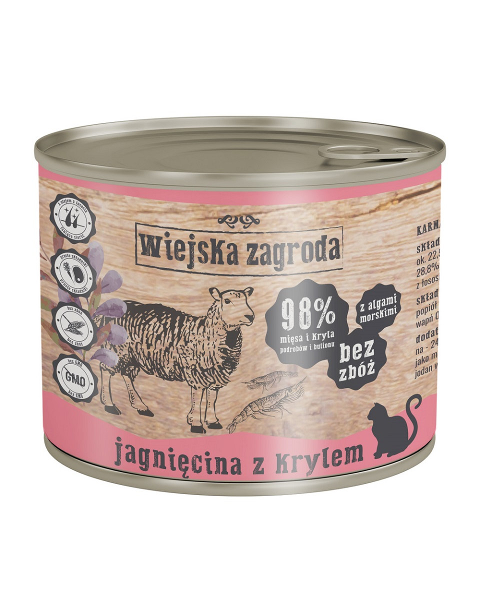 Bezzbożowa, pełnoporcjowa karma z jagnięciną i krylem przeznaczona dla dorosłych kotów.
