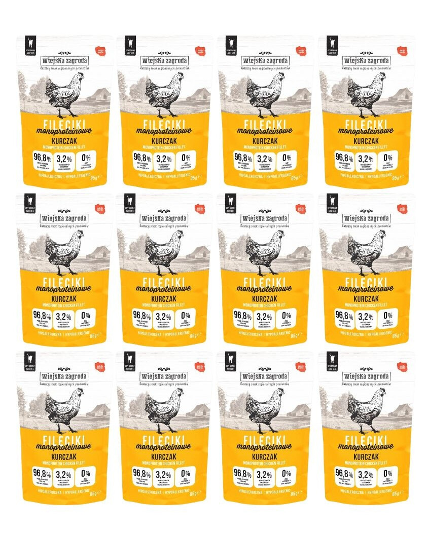 Dlaczego warto wybrać fileciki z kurczaka od Wiejskiej Zagrody?Wiejska Zagroda karma mokra dla kota fileciki Kurczak to idealna mokra karma dla kotów dorosłych. Dzięki wysokiej zawartości mięsa i delikatnej strukturze filecików doskonale sprawdzi się zarówno dla wybrednych kotów, jak i tych z wrażliwym układem pokarmowym. Dzięki praktycznym saszetkom 85 g, karmienie kota jest niezwykle wygodne. Wybierz polską markę cenioną za najwyższą jakość składników i zapewnij swojemu pupilowi wszystko, co najlepsze!