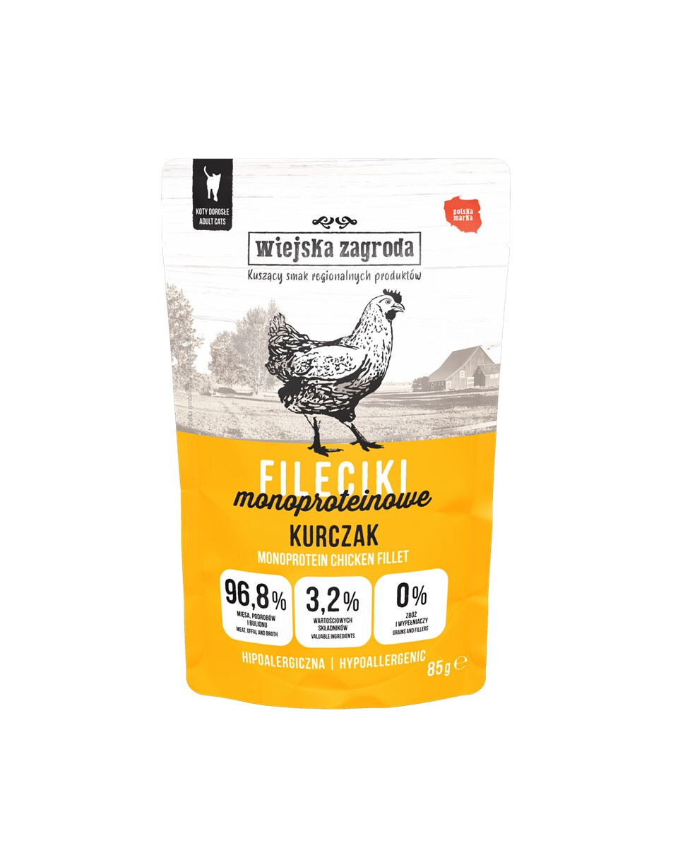 Szukasz naturalnej mokrej karmy dla kota w formie delikatnych, soczystych filecików zanurzonych w aromatycznym sosie? Monoproteinowe fileciki Wiejska Zagroda to idealny wybór! Każda saszetka zawiera starannie wyselekcjonowane kawałeczki mięsa kurczaka o doskonałej konsystencji, które są wyjątkowo apetyczne dla każdego kota. Dzięki aż 96,8% zawartości mięsa, podrobów oraz bulionu, bezzbożowej recepturze oraz hipoalergicznemu składowi, fileciki sprawdzą się nawet u kotów z delikatnym układem pokarmowym.