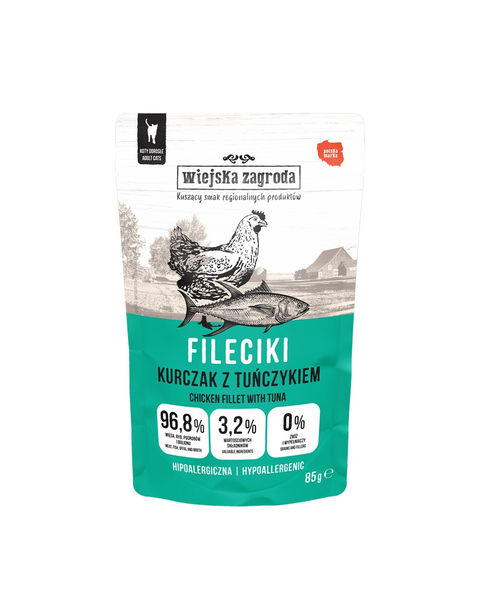 Dlaczego warto wybrać fileciki z kurczaka i tuńczyka od Wiejskiej Zagrody?Wiejska Zagroda karma mokra dla kota fileciki Kurczak z Tuńczykiem to idealna mokra karma dla kotów dorosłych. Dzięki wysokiej zawartości mięsa i delikatnej strukturze filecików doskonale sprawdzi się zarówno dla wybrednych kotów, jak i tych z wrażliwym układem pokarmowym. Dzięki praktycznym saszetkom 85 g, karmienie kota jest niezwykle wygodne. Wybierz polską markę cenioną za najwyższą jakość składników i zapewnij swojemu pupilowi wszystko, co najlepsze!