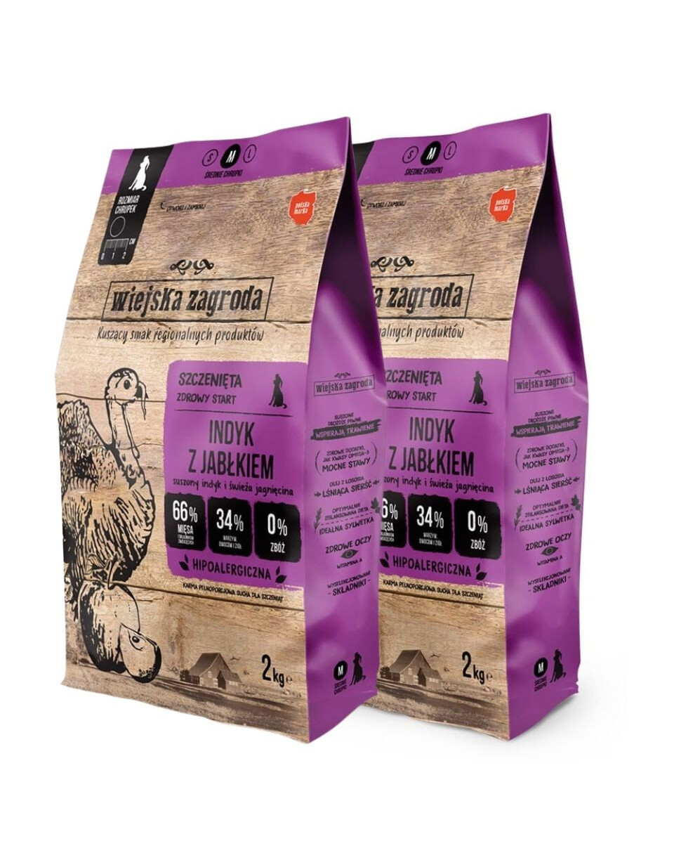 To smakowita propozycja na zdrowy start dla większych szczeniąt! Karma powstała z połączenia trzech niezwykłych składników: indyka + jagnięciny + jabłek. Indyk to doskonałe źródło lekkostrawnego i odżywczego białka, wspiera odporność dzięki zawartości fosforu, żelaza, potasu oraz witamin z grupy A, B i E. Jagnięcina jest delikatna i zdrowa. Polecana szczególnie alergikom i psom wrażliwym. W połączeniu z bogatymi w błonnik i witaminy jabłkami tworzy idealną propozycję na start dla każdego szczeniaka! Całość dopełnia olej z łososia, który oprócz dobroczynnego wpływu na cały organizm, dba o dobrą kondycję skóry i piękną lśniącą sierść!