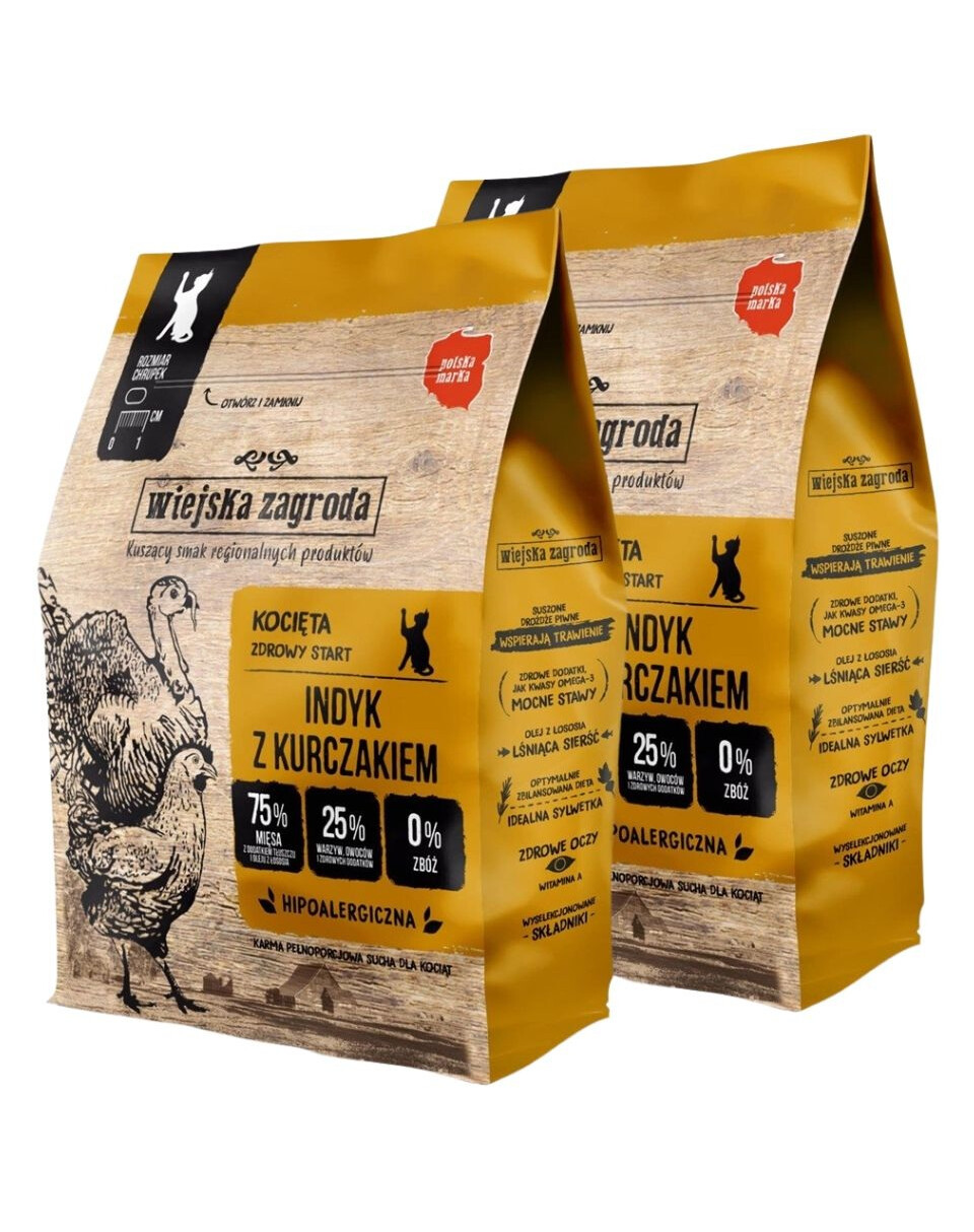 Wiejska Zagroda to polska karma premium, stworzona z myślą o kociętach, które potrzebują naturalnego, mięsnego pożywienia w codziennej diecie. Jej receptura oparta jest na 65,5% mięsa i składników pochodzenia zwierzęcego, pochodzących od lokalnych dostawców. Dzięki połączeniu delikatnego indyka i kurczaka, karma dostarcza lekkostrawnego białka, witamin i minerałów niezbędnych do prawidłowego wzrostu.