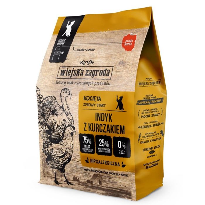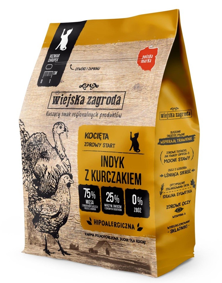Wiejska Zagroda to polska karma premium, stworzona z myślą o kociętach, które potrzebują naturalnego, mięsnego pożywienia w codziennej diecie. Jej receptura oparta jest na 65,5% mięsa i składników pochodzenia zwierzęcego, pochodzących od lokalnych dostawców. Dzięki połączeniu delikatnego indyka i kurczaka, karma dostarcza lekkostrawnego białka, witamin i minerałów niezbędnych do prawidłowego wzrostu.