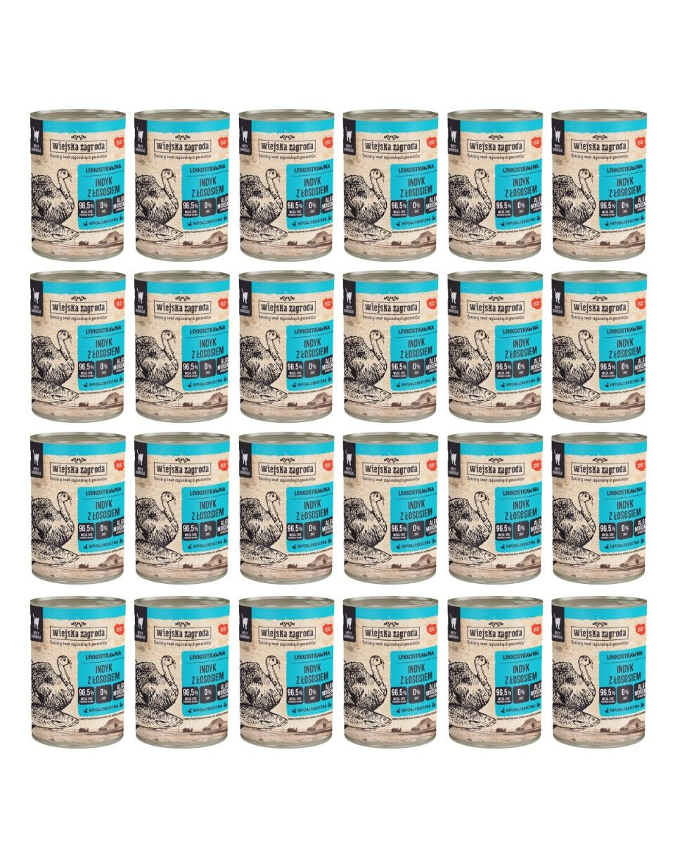 SKŁAD: 44 % indyk (12 % mięso, 12 % wątroba, 10 % serca, 10 % żołądki), 26,5 % bulion, 26 % łosoś, 3,3 % składniki mineralne, 0,1 % olej z łososia, 0,1 % spirulina.
