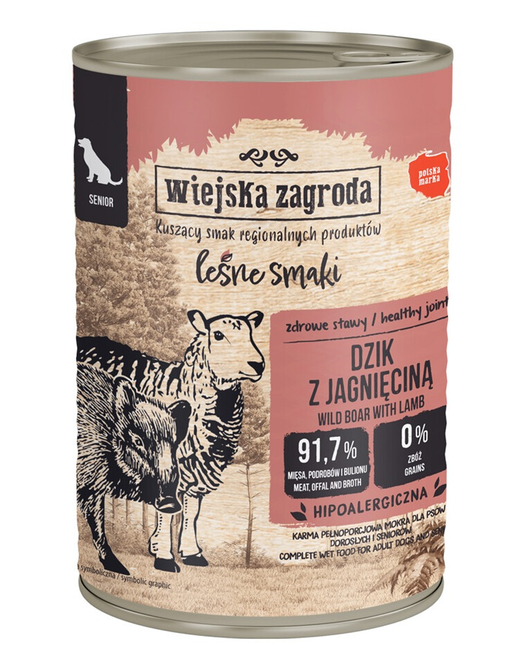 Wiejska Zagroda Leśne Smaki – Dzik z Jagnięciną to nie tylko pyszny, naturalny posiłek. To przemyślana, funkcjonalna karma, która dba o zdrowie stawów, odporność i ogólną kondycję Twojego psa – każdego dnia, w zgodzie z naturą.
