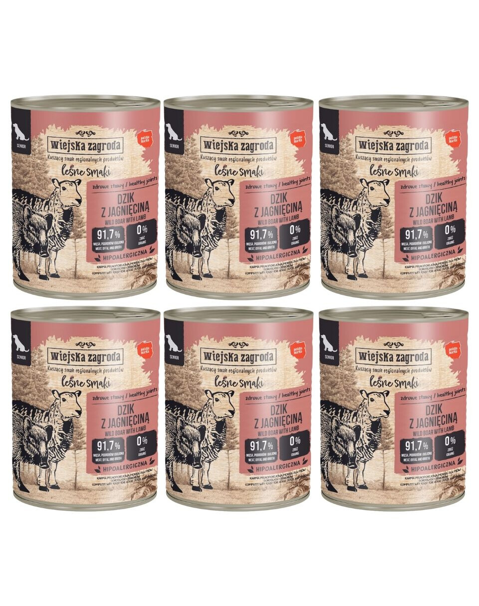 SKŁAD: 50 % mięso z dzika, 15 % jagnięcina (7 % mięso, 3 % płuca, 3 % wątroba, 2 % tchawice), 26,7 % bulion, 4 % jagody, 2 % burak, 1 % składniki mineralne, 0,3 % olej z łososia, 0,2 % suszone drożdże piwne, 0,2 % spirulina, 0,2 % Jukka Mojave, 0,2 % żurawina, 0,1 % rumianek, 0,06 % glukozamina, 0,04 % siarczan chondroityny.