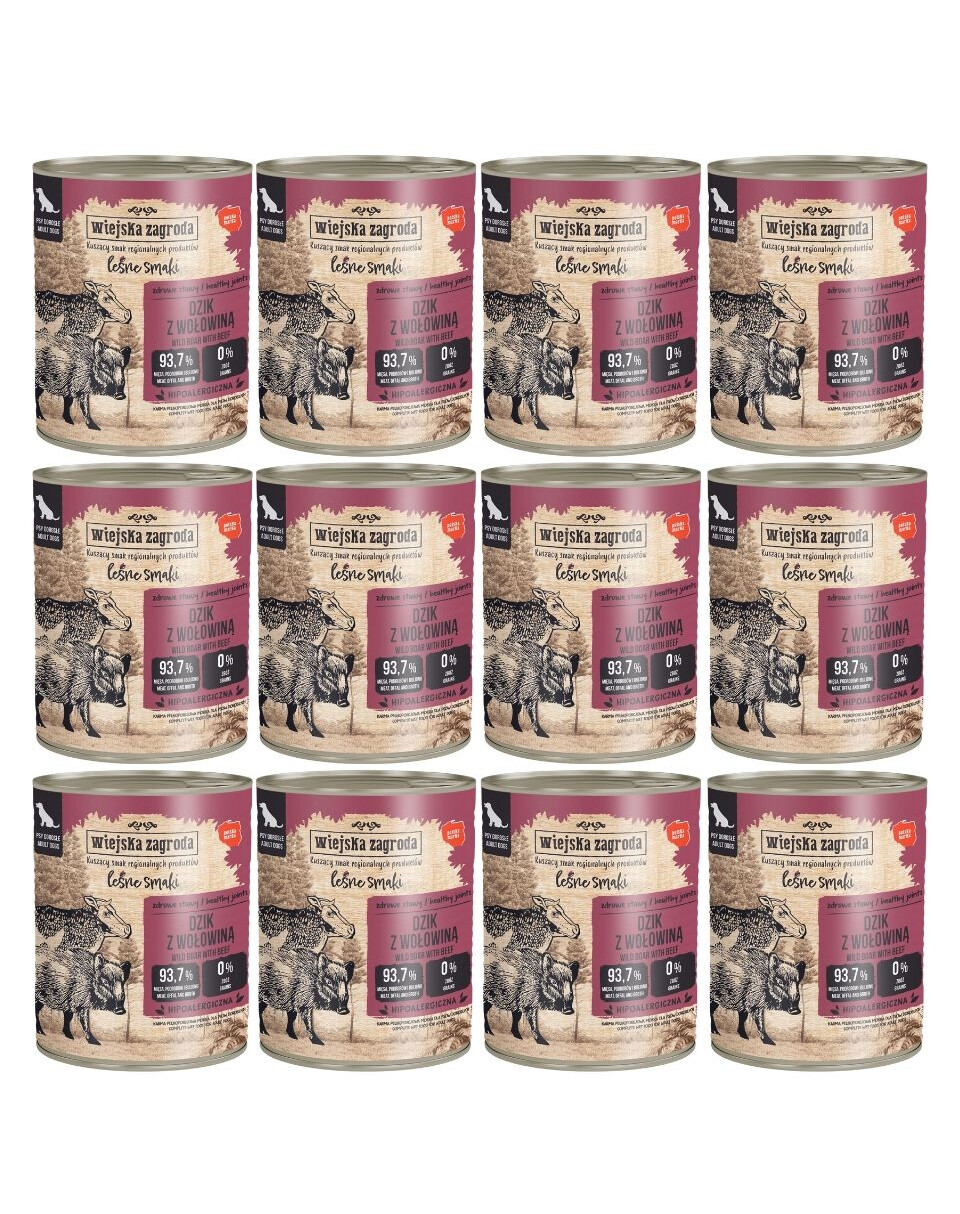 SKŁAD: 53 % mięso z dzika, 15 % wołowina (8 % mięso, 3 % płuca, 3 % wątroba, 2 % nerki), 25,7 % bulion, 4 % jeżyny, 1% składniki mineralne, 0,3 % olej z łososia, 0,2 % suszone drożdże piwne, 0,2 % spirulina, 0,2 % Jukka Mojave, 0,2 % dzika róża, 0,1 % rumianek, 0,06 % glukozamina, 0,04 % siarczan chondroityny.