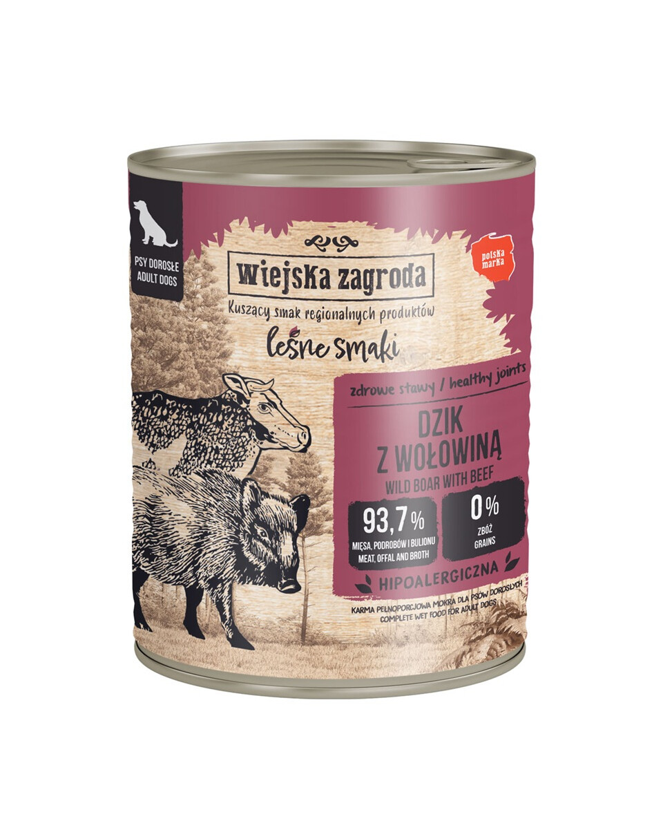 SKŁAD: 53 % mięso z dzika, 15 % wołowina (8 % mięso, 3 % płuca, 3 % wątroba, 2 % nerki), 25,7 % bulion, 4 % jeżyny, 1% składniki mineralne, 0,3 % olej z łososia, 0,2 % suszone drożdże piwne, 0,2 % spirulina, 0,2 % Jukka Mojave, 0,2 % dzika róża, 0,1 % rumianek, 0,06 % glukozamina, 0,04 % siarczan chondroityny.