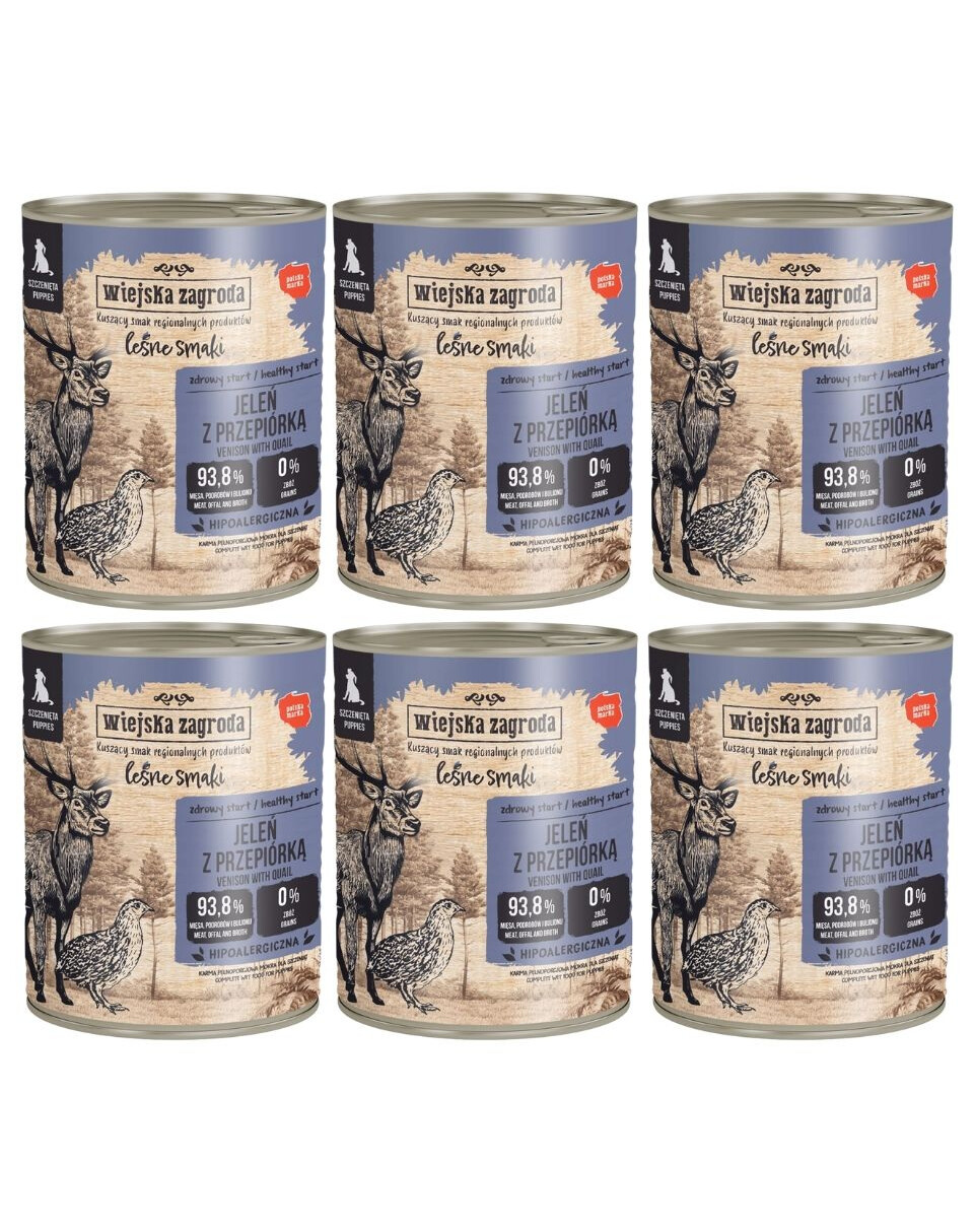 SKŁAD: 53 % mięso z jelenia, 15 % przepiórka (12 % mięso, 3 % wątroba), 25,8 % bulion, 4 % jagody, 1 % składniki mineralne, 0,3 % olej z łososia, 0,2 % suszone drożdże piwne, 0,2 % spirulina, 0,2 % Jukka Mojave, 0,2 % dzika róża, 0,1 % mięta.