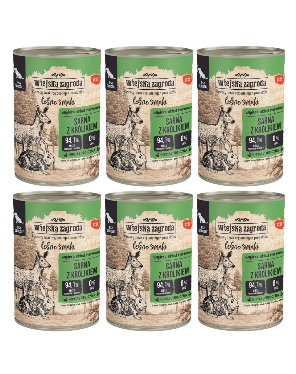 SKŁAD: 53 % mięso z sarny, 15 % królik (7 % mięso, 3 % serca, 3 % nerki, 2 % płuca), 25,8 % bulion, 4 % maliny, 1 % składniki mineralne, 0,3 % olej z łososia, 0,2 % suszone drożdże piwne, 0,2 % spirulina, 0,2 % Jukka Mojave, 0,2 % dzika róża, 0,1 % mięta.