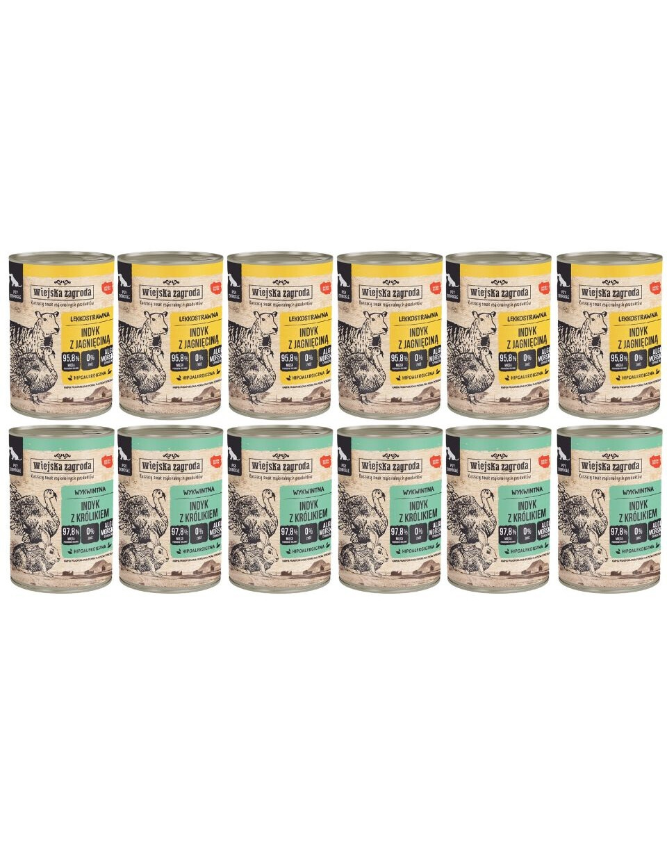 Zestaw WIEJSKA ZAGRODA Mix smaków Indyk z jagnięciną i Indyk z królikiem 12x400 g zawiera: