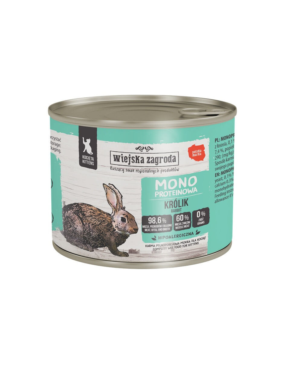 SKŁAD: 70 % królik (60 % mięso, 10 % wątroba), 28,6 % bulion z królika, 1 % składniki mineralne, 0,2 % olej z łososia, 0,1 % drożdże piwne suszone, 0,1 % ekstrakt Yucca Mojave.